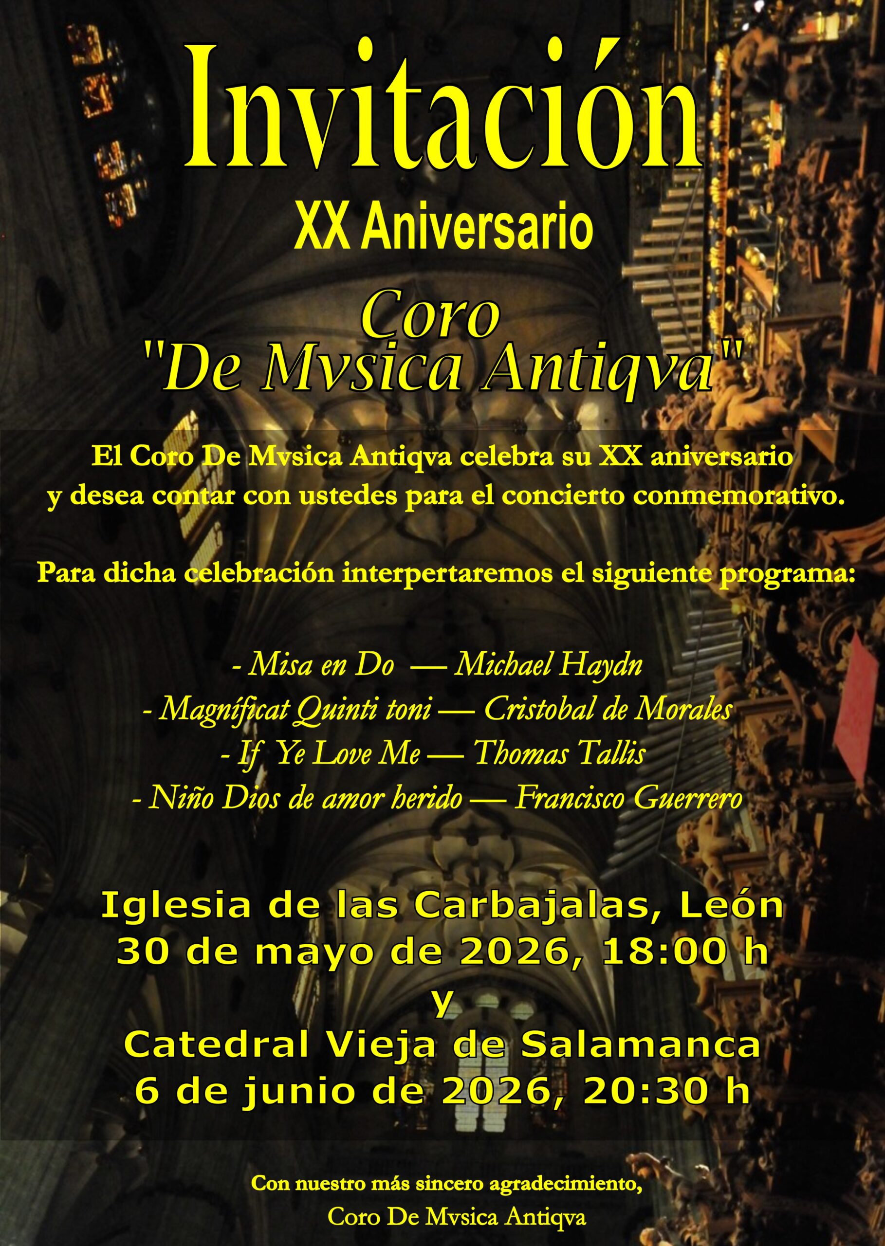 Este año es muy especial para De Mvsica Antiqva, pues celebramos el 20 aniversarios desde que dimos nuestro primer concierto en Piedrahita en mayo del año 2006. Con este motivo hemos elegido para el concierto de aniversario el mejor de los escenarios, la Catedral Vieja de Salamanca, lugar de belleza increíble y una maravillosa acústica. Para la ocasión hemos elegido un repertorio que refleja el recorrido del coro a lo largo de estos 20 años. La elección de la Misa en Do de Michael Haydn, hermano menor del famosísimo Joseph Haydn y compositor mucho menos conocido por el publico en general, refleja lo recogido en los estatutos de nuestro coro, en los que nos imponemos la misión de dar a conocer al público a autores poco interpretados o bien obras menos conocidas de autores relevantes.